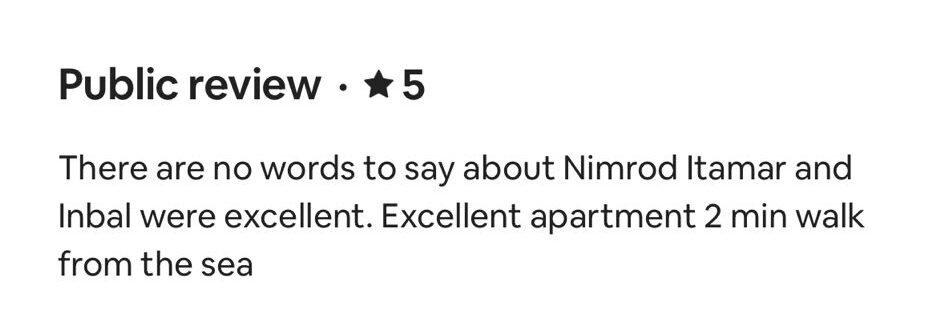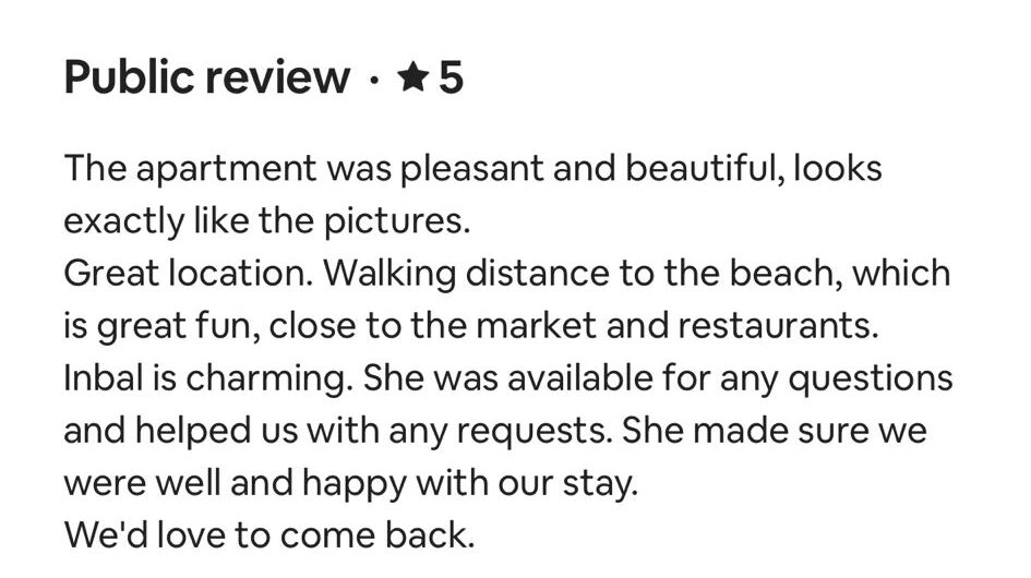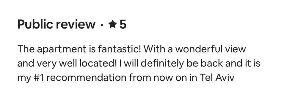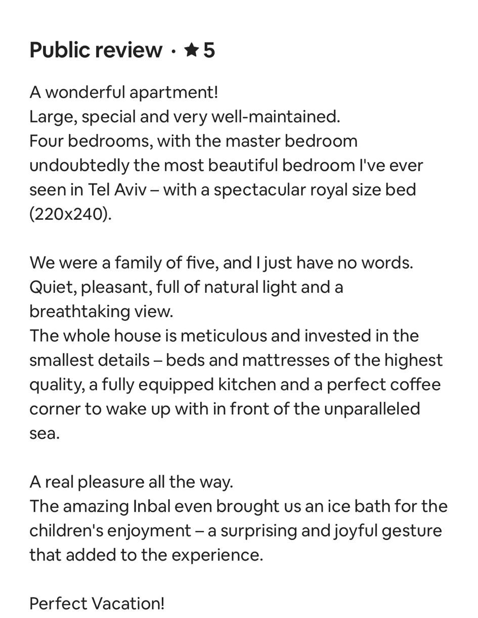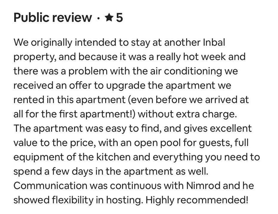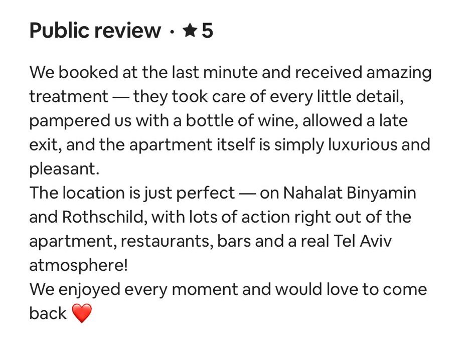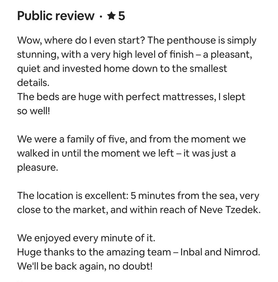 EXCELLENT Based on 164 reviews Posted on דיאנה גלינקיTrustindex verifies that the original source of the review is Google. היינו בדירה הסופ״ש באילת 61 ובאמת היה מדהים. דירה מרווחת ממש והמחיר באמת זול לתמורה שקיבלנו. כיף לראות שיש דירות כאלו, אין ספק שנחזור להתארח שוב אצל נמרוד!Posted on נויה שולTrustindex verifies that the original source of the review is Google. הגענו לחופשה בתל אביב ולצערינו המקום בו תכננו לשהות נעלם. למזלינו הרב הגענו לנמרוד המלאך שקלט אותנו, ארגן מיטות נוספות לבקשותינו, היה זמין לכל פניה בכל שעה ודאג שהכל מצוין. כמובן שחשןב לציין שהדירה עצמה הייתה מהממת, נקייה, מאובזרת ונעימה איך ספק שבכל פעם בה נגיע לתל אביב לא נצטרך לחפש יותר ממי לקחת כי כבר מצאנוPosted on Heli Shlomi (חלי שלומי)Trustindex verifies that the original source of the review is Google. התארחנו 6 חברות בדירה ברחוב נחמני, קודם כל עוד לפני שהגענו הבעלים היה זמין ונגיש ואדיב מאד. הדירה עצמה הייתה מהממת והכי חשוב נקייה!! הכל היה מתוקתק ומבריק, המצעים, המגבות, הריח בבית. פשוט מושלם. הוא היה זמין לכל שאלה או בקשה ובקיצור אין ספק שנחזור שוב 🤍Posted on דניאל עטיהTrustindex verifies that the original source of the review is Google. אחלה גבר נתן שירות מעולה זמין בכל שעה אפשר לסמוך עליו בכסף בהכלPosted on Shaked NachmaniTrustindex verifies that the original source of the review is Google. האירוח בדירה היה מושלם. נתחיל מזה שערב קודם להגעה קיבלנו שיחת טלפון מבעל הנכס שהודיע שמתקיימים שיפוצים ליד הדירה (דבר שהוא לא מובן מאליו בפני עצמו - יכל לתת לנו להגיע לשם מבלי להודיע, קרה לנו בעבר) ובגלל זה הוא משדרג אותנו לדירה אחרת. הדירה שקיבלנו הייתה מהממת! במיקום הרבה יותר טוב ממש על הים עם חנייה - דירה מרווחת ונקייה! ממש עם ריח של נקיון ומרגישים מיד בבית. רוצים להודות לכם על שירות מושלם - מענה מהיר ויחס אישי וחם. תודה על היושר והכנות. אם יכלנו - היינו נשארים עוד לילה.Posted on alon alonTrustindex verifies that the original source of the review is Google. Perfect apartment, centrally and perfectly located at the heart of the city. Great Jacuzzi on rooftop. Will surely come back.Posted on נתנאל אמרוסיTrustindex verifies that the original source of the review is Google. הכי טובים בתחום האירוח בתל אביב דירות ברמה גבוה ושירות מצוין